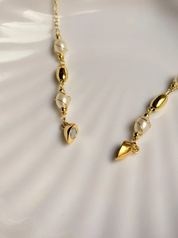Este elegante collar presenta un diseño innovador que incluye un dije imantado en forma de corazón más una selección de perlas blancas y doradas. La cadena complementa el diseño con sutileza, aportando un toque moderno y refinado.